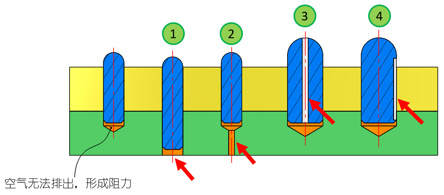 銷組裝于盲孔,空氣沒有通道流通會形成阻力,要耗費大力氣安裝。 最佳解決方式為增加通氣孔,所以常將孔設計為1.貫穿孔、2.盲孔下方再多小孔。 若是大直徑的銷,可于采購時選擇3.貫穿中心孔型式,或是請供應商二次加工將銷的4.側邊制作溝槽,有利空氣排出。