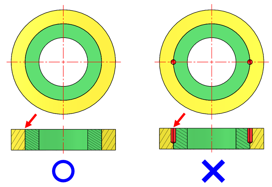 當定位銷設計在對稱位置,在現場組裝容易發生零件裝反現象,進而影響到機構運動或是造成零件的磨損,所以最好采取左圖范例,將2個尺寸設計不同,算是一種防呆裝置。
